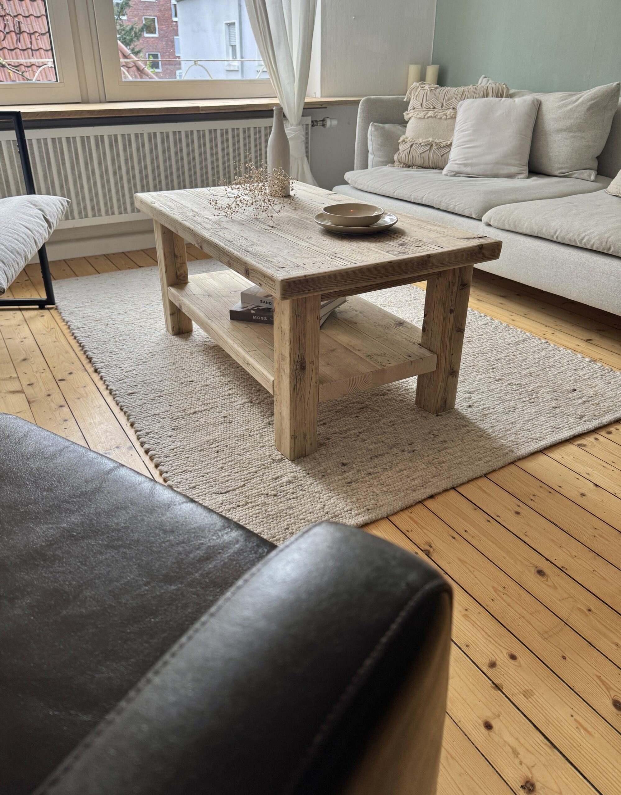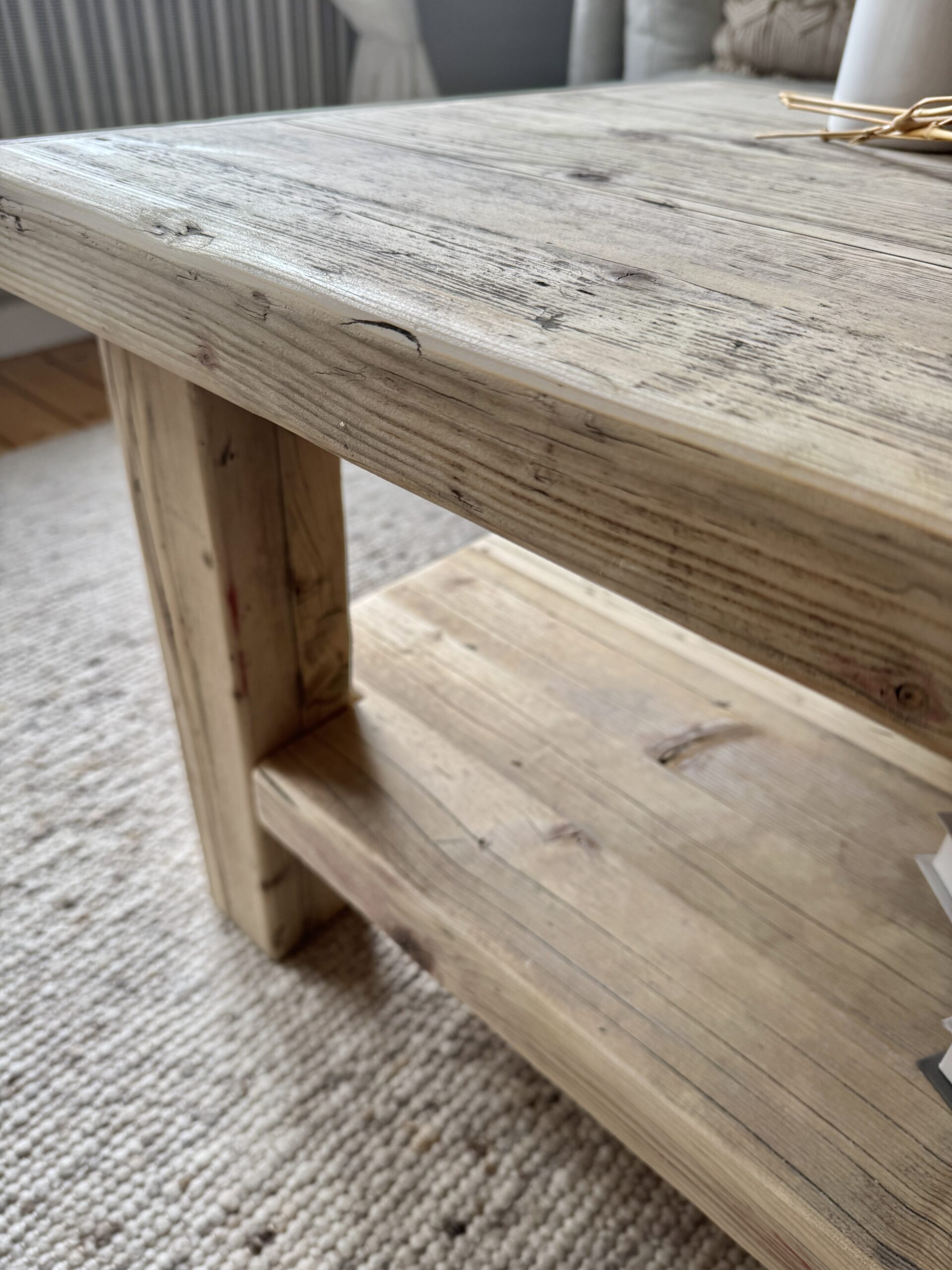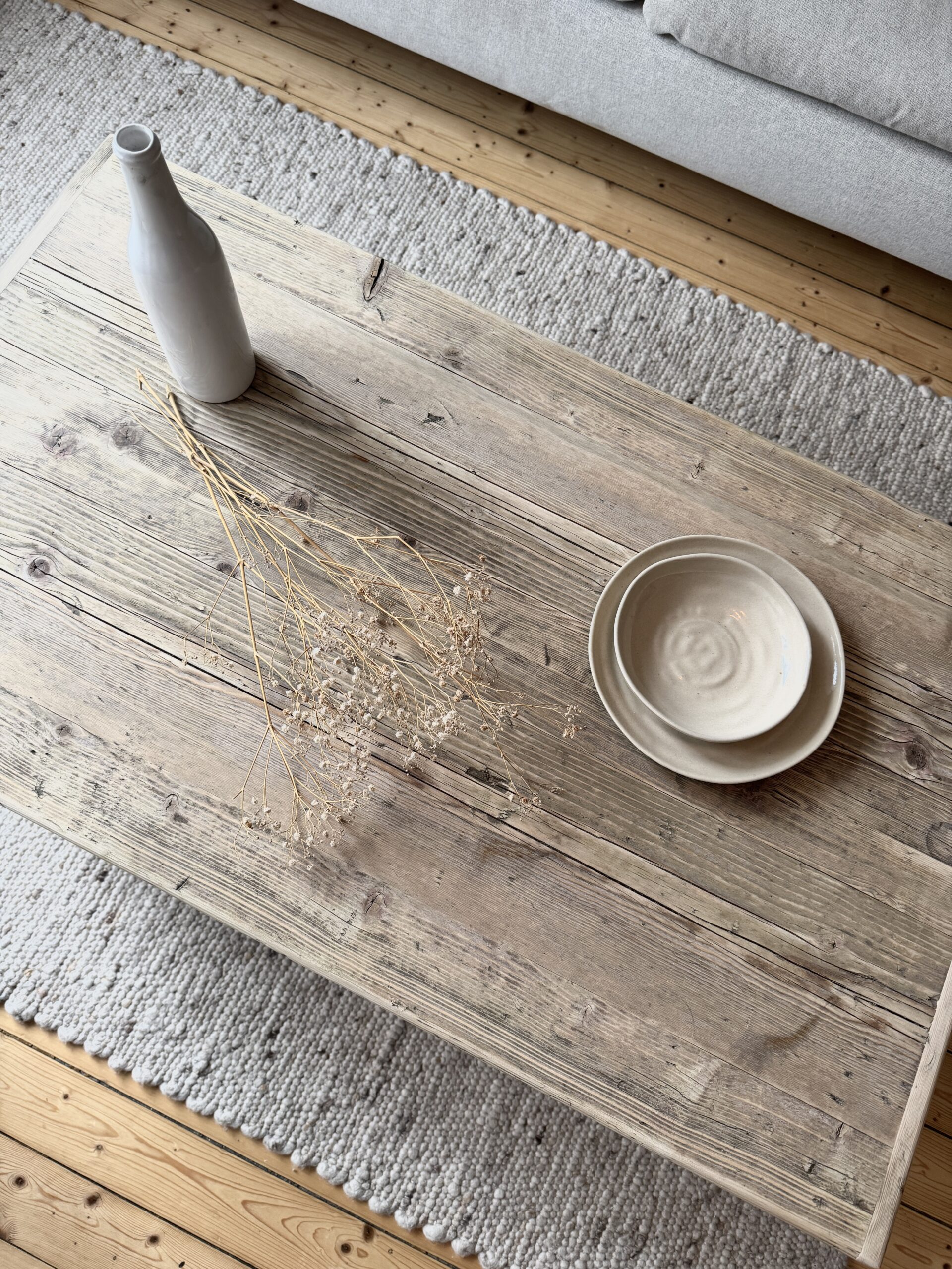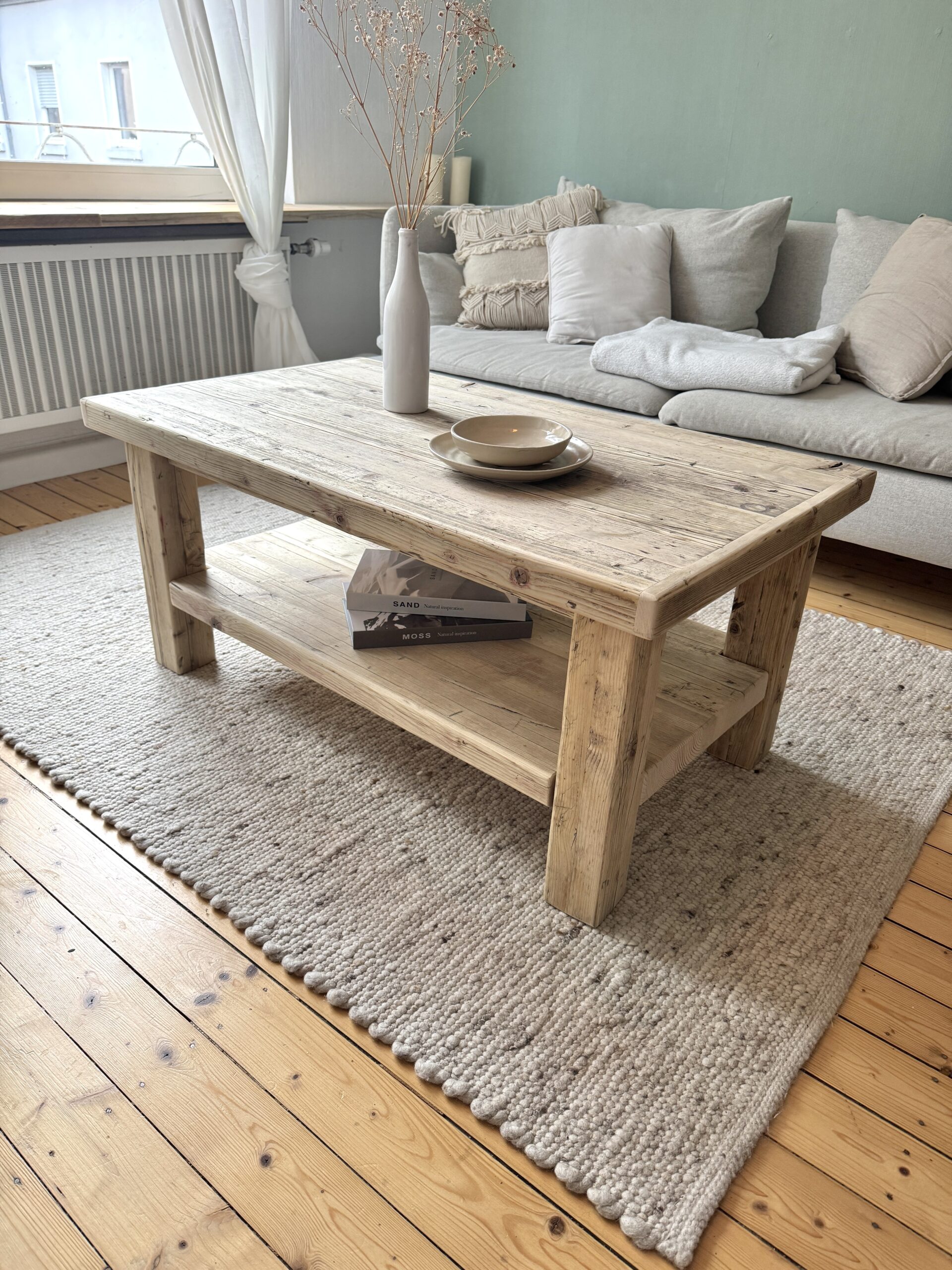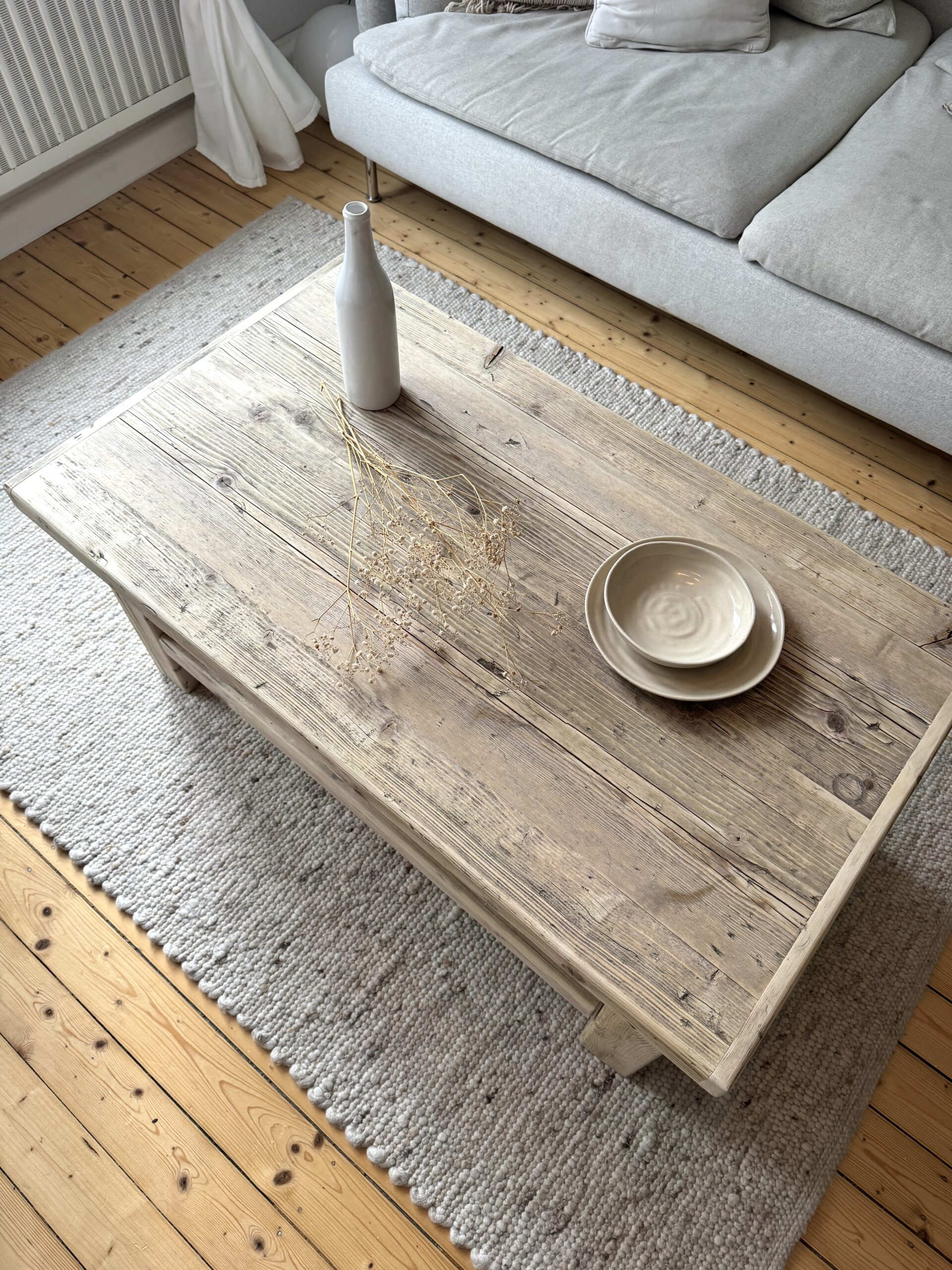 Dieser Couchtisch besteht zu 100% aus Recyclingholz. Durch den vorherigen Einsatz im Gerüstbau weist das Holz und Risse und Machen auf, die jeden Tisch zu einem Unikat machen. Das Holz wird zunächst aufgetrennt und mit einander verleimt. Anschließend wird es in mehreren Schritten grob und fein geschliffen und gebürstet, um die Reste vom Gerüstbau zu entfernen. Die Maserung und Gebrauchsspuren bleiben jedoch erhalten. Der Couchtisch wird mit einem speziellen Öl versiegelt. Hierdurch wird er resistenter gegen Flüssigkeiten wie Wasser, Tee, Kaffe etc.. Außerdem kommen die Maserung und die Gebrauchsspuren besser zum Vorschein.