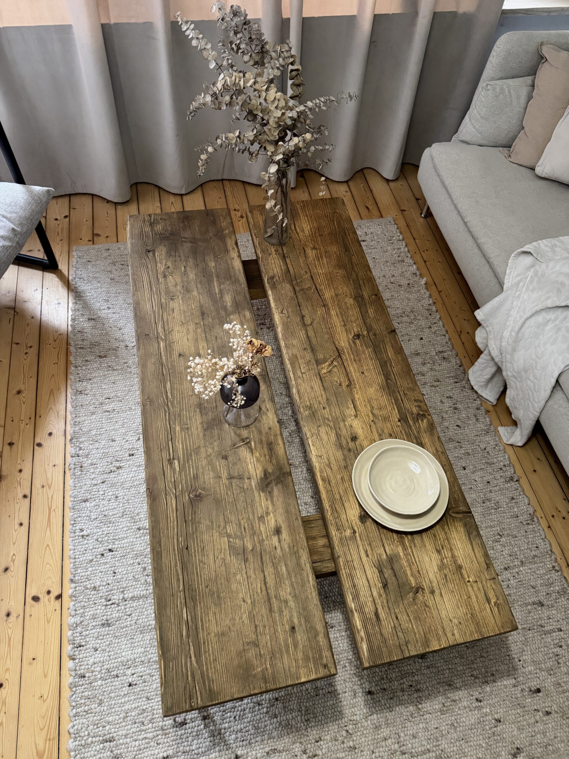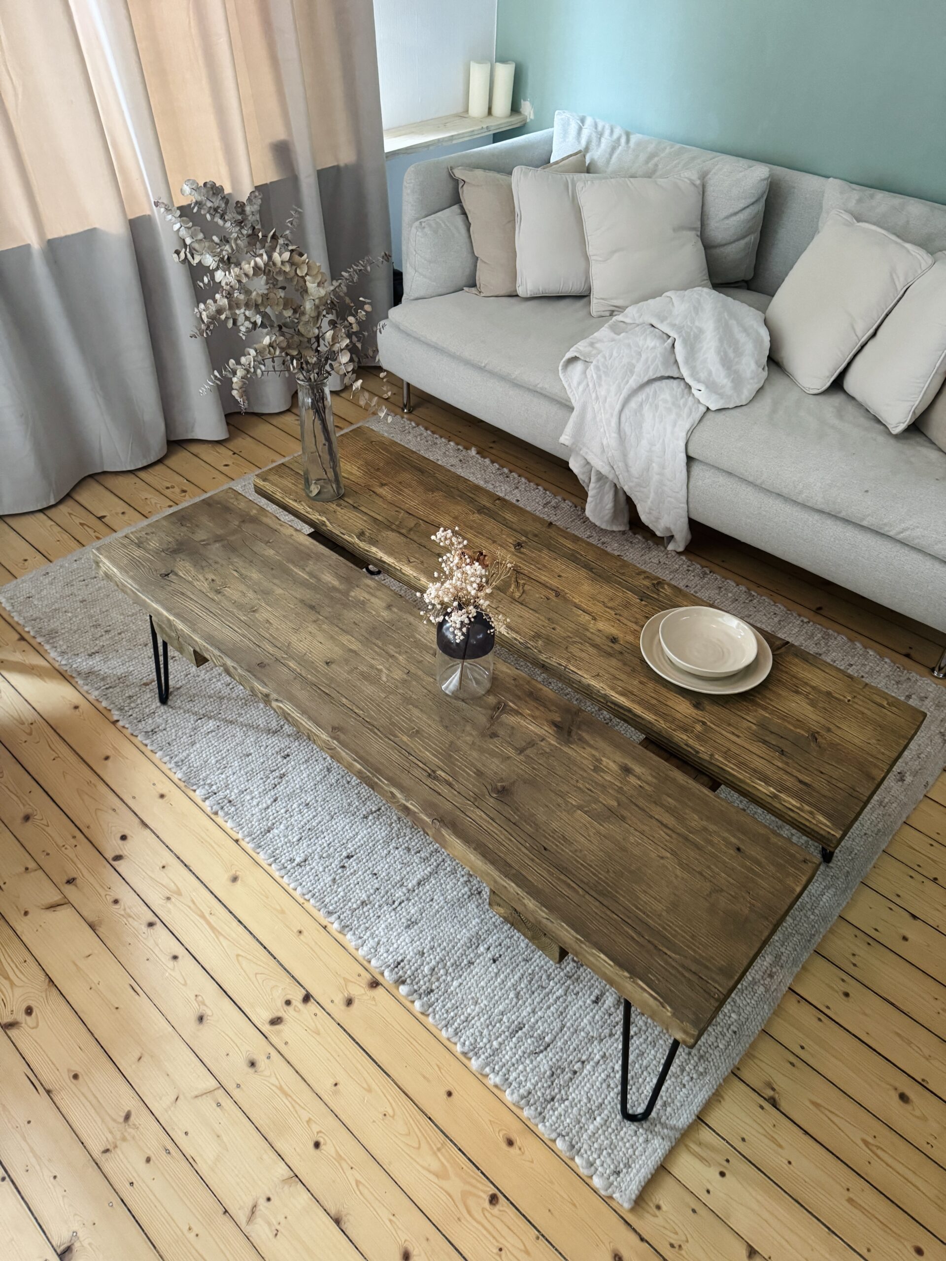Dieser rustikale Couchtisch wird aus Gerüstbohlen, lokal in unseren Werkstätten im Münsterland vom Tischlermeister und Kunsthandwerker gefertigt. Das Holz bringt durch teilweise jahrzehntelange Nutzung im Gerüstbau eine ganz eigene Geschichte mit.