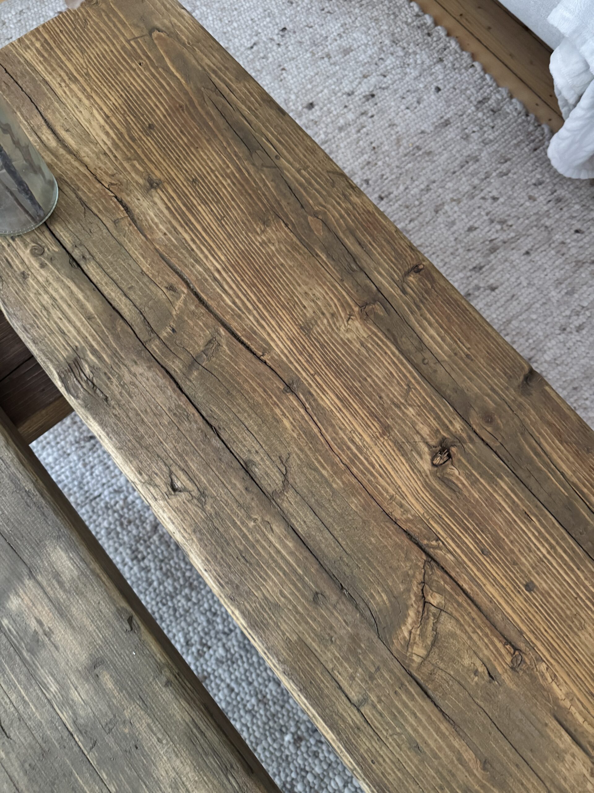 Da es sich um Altholz handelt, weist das Holz Risse, Schnitte und Macken auf. Dies macht jeden Coffeetable zu einem individuellen Einzelstück.