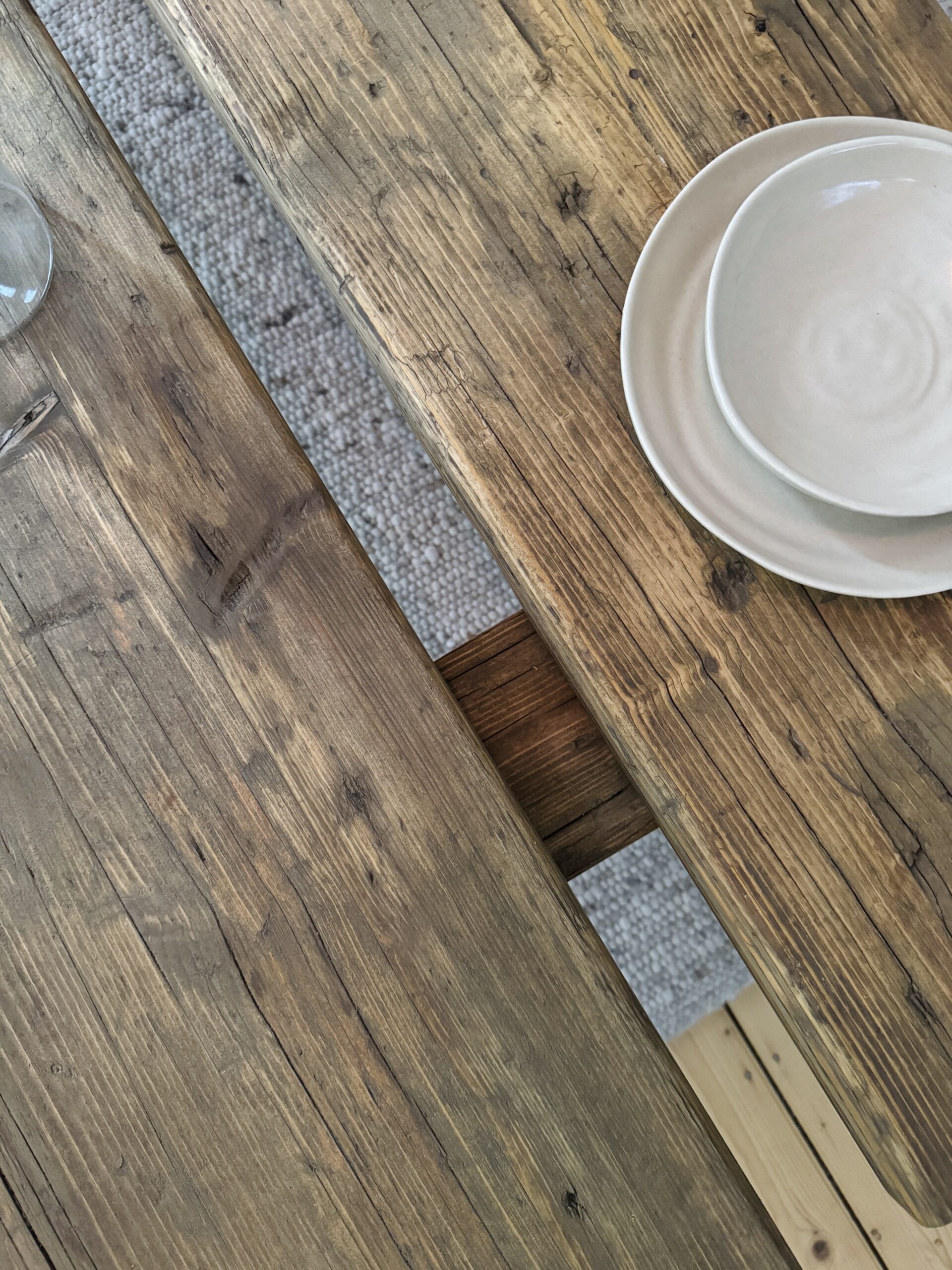 Die Gerüstbohlen werden in mehreren Schritten gebürstet und geschliffen. Anschließend wird der Tisch mit einem speziellen dunklen Hartwachsöl behandelt, wodurch er resistenter gegen Flüssigkeiten, wie Kaffee, Tee, Wasser etc. wird.