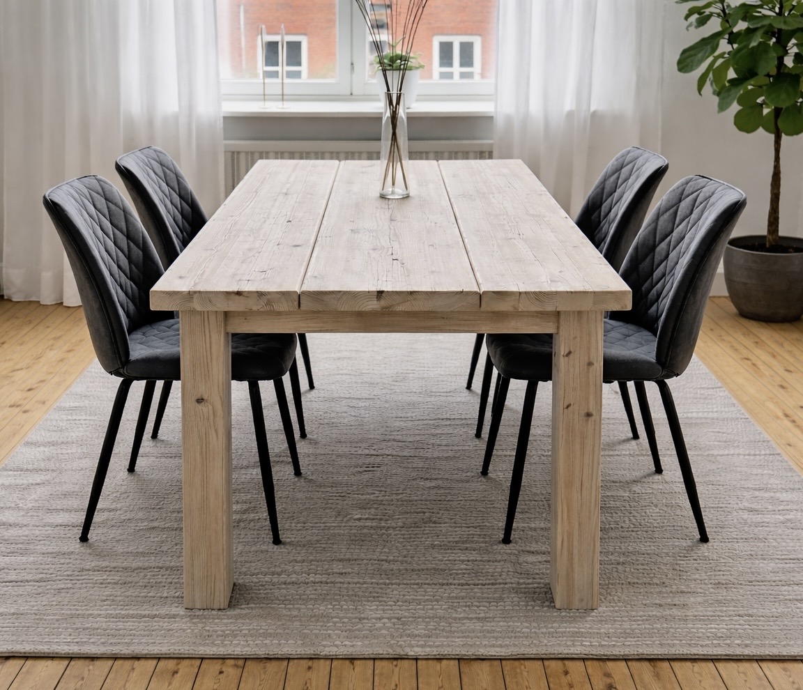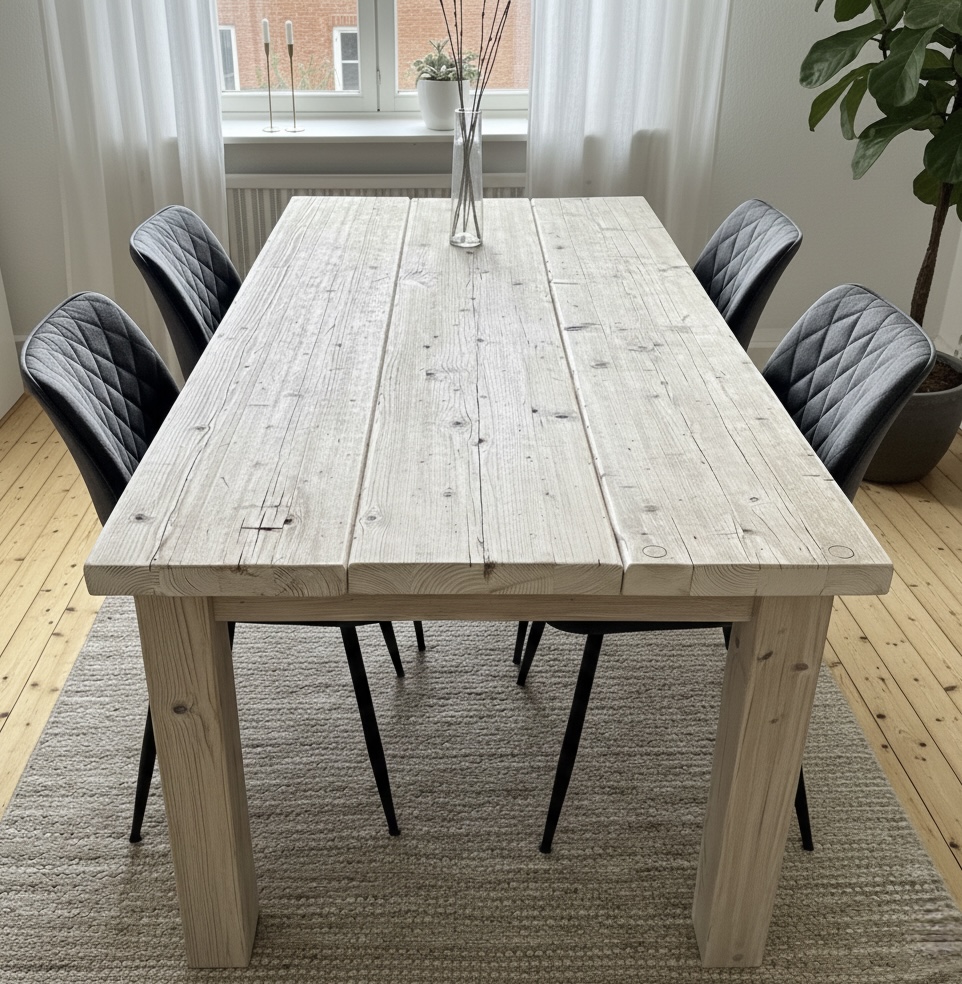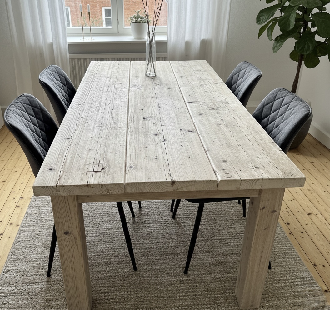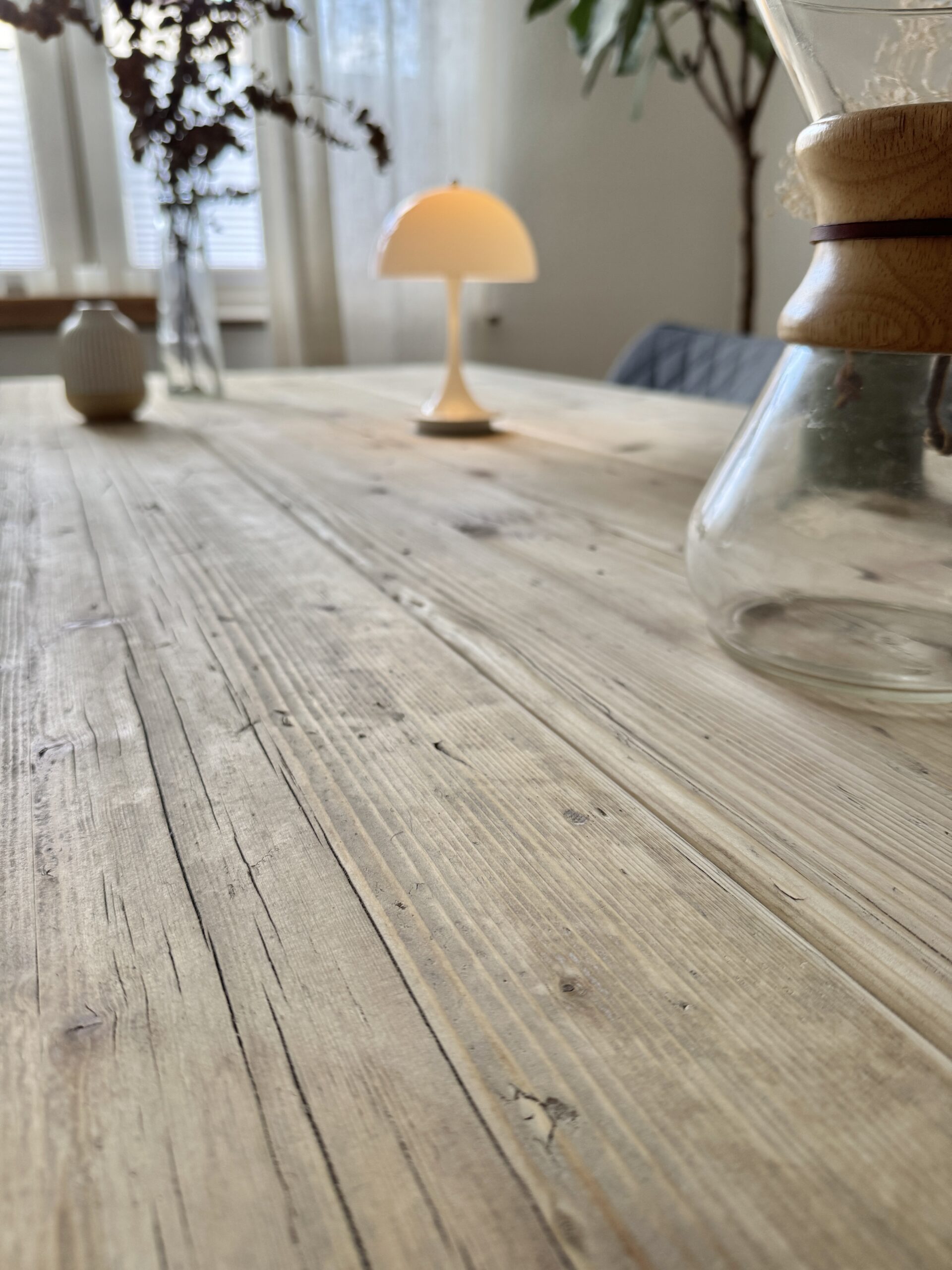 Dieser Esstisch im Landhausstil wird aus Gerüstbohlen, lokal in unseren Werkstätten im Münsterland vom Tischlermeister gefertigt. Das Holz bringt durch teilweise jahrzehntelange Nutzung im Gerüstbau eine ganz eigene Geschichte mit.
