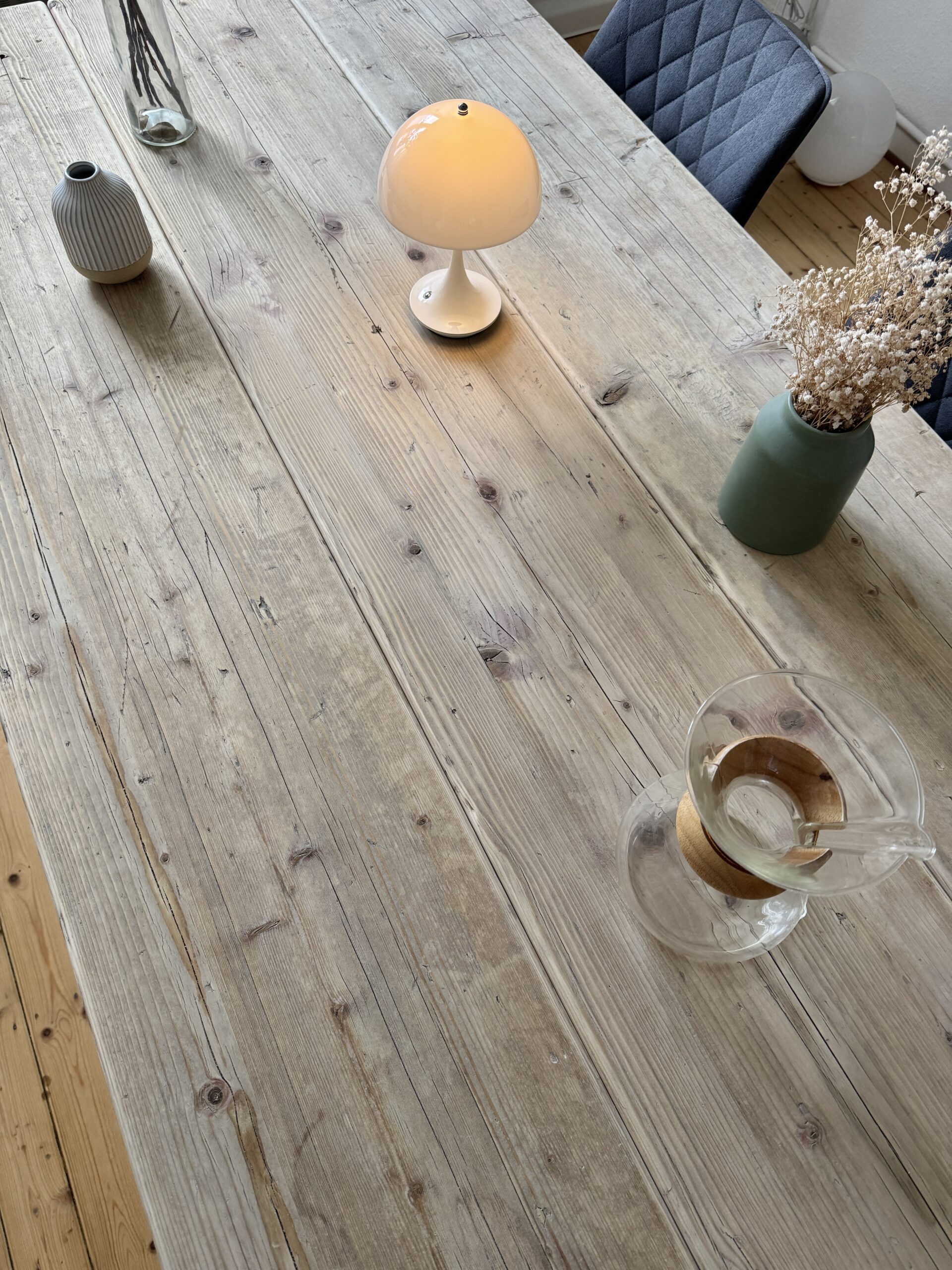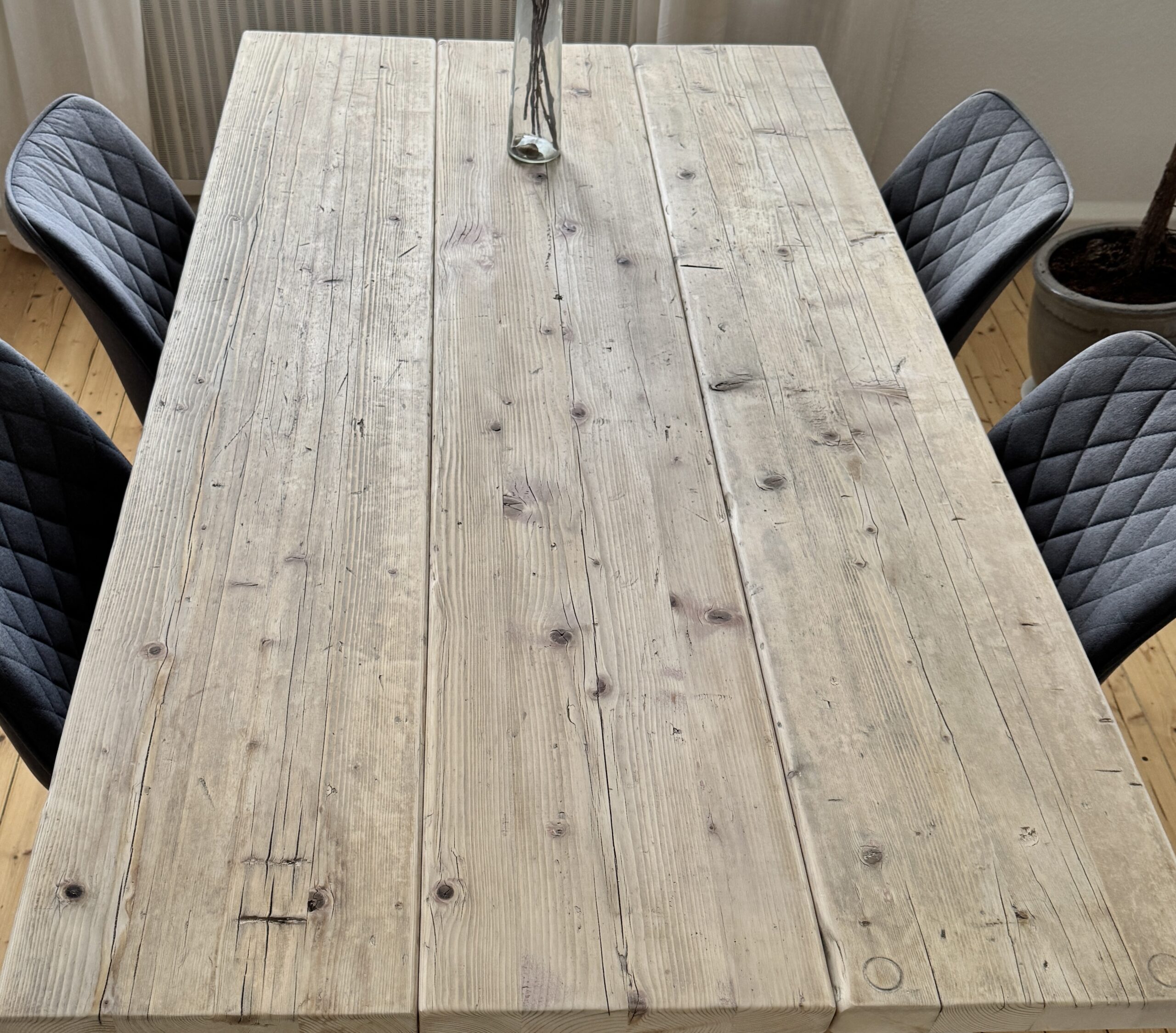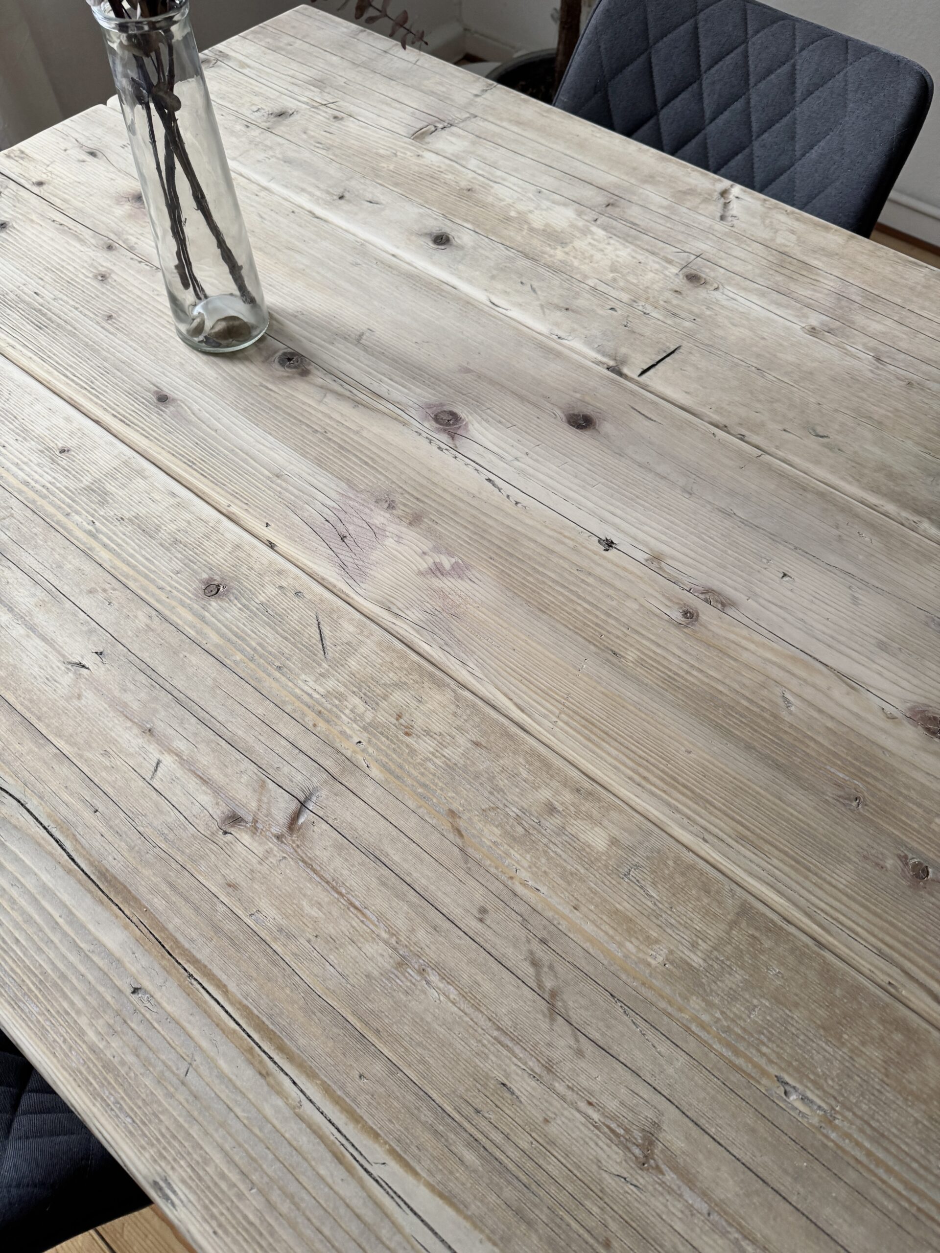 Das Holz weißt auf Grund der vorherigen Nutzung im Gerüstbau Macken, kleine Risse und andere Gebrauchsspuren auf. Dies macht jeden Tisch zu einem Unikat.