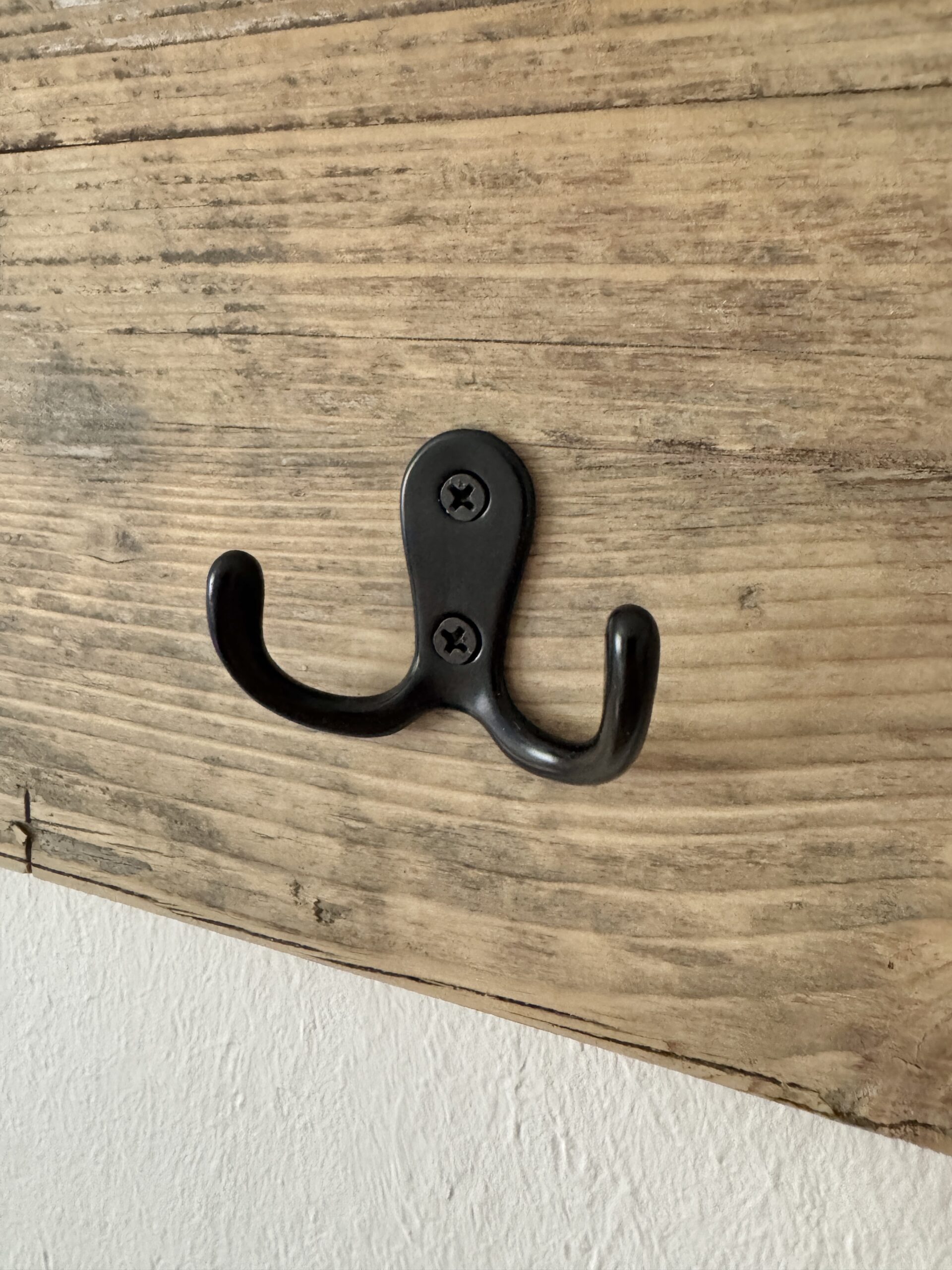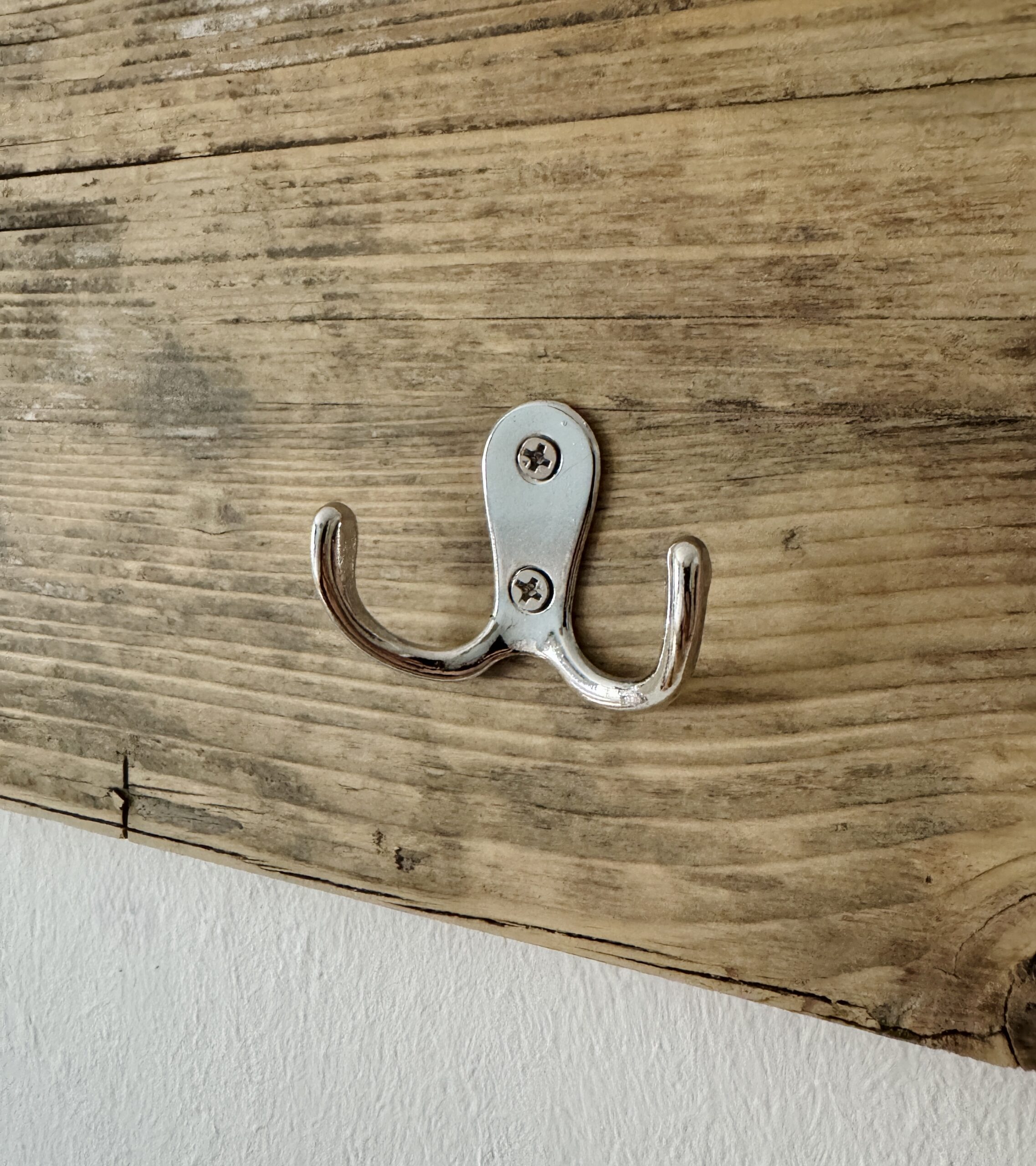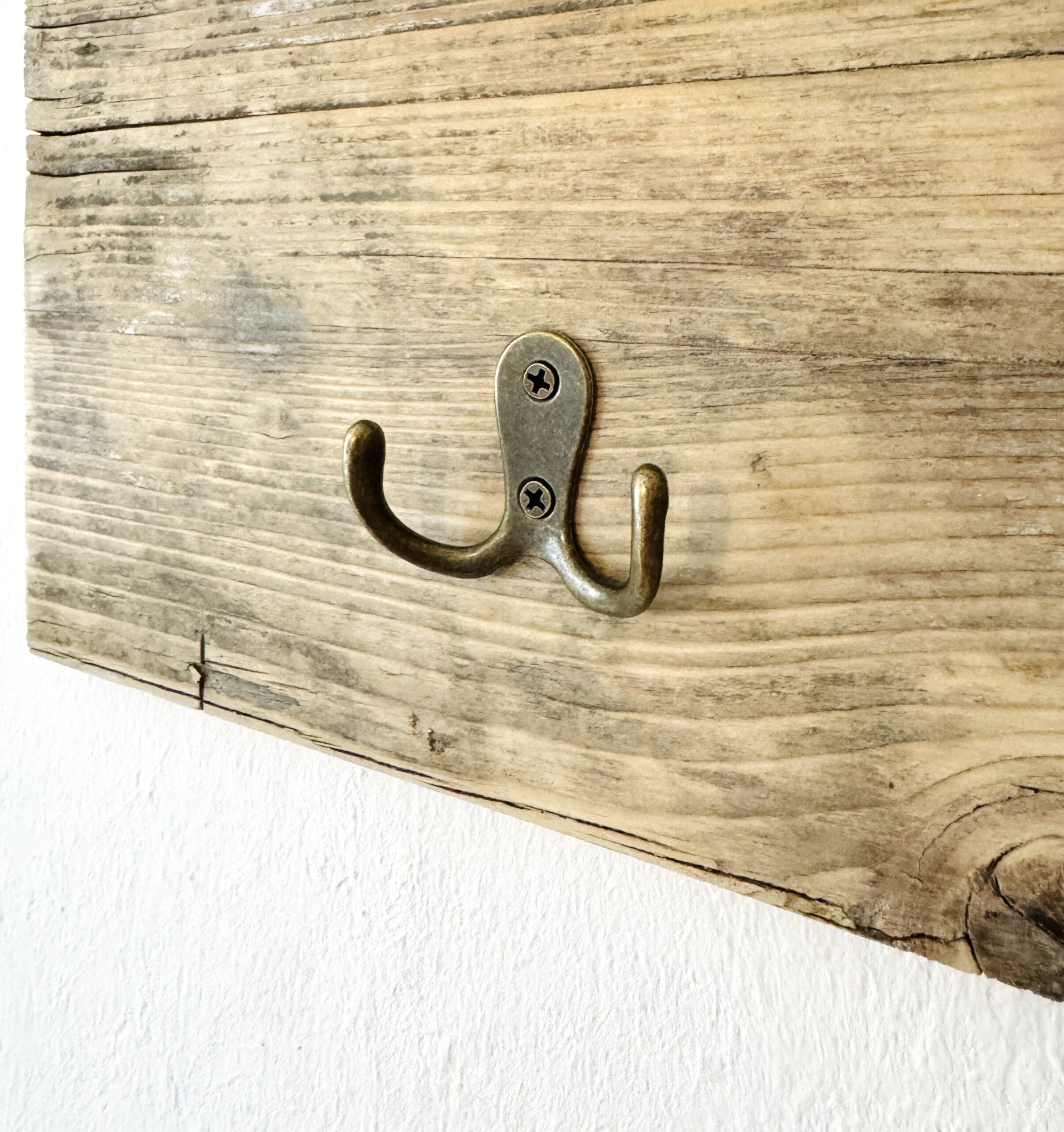Unsere einzigartige Garderobe aus hochwertigem Altholz und vier stabilen Kleiderhaken aus Gusseisen ist die perfekte Ergänzung für Ihr Zuhause.