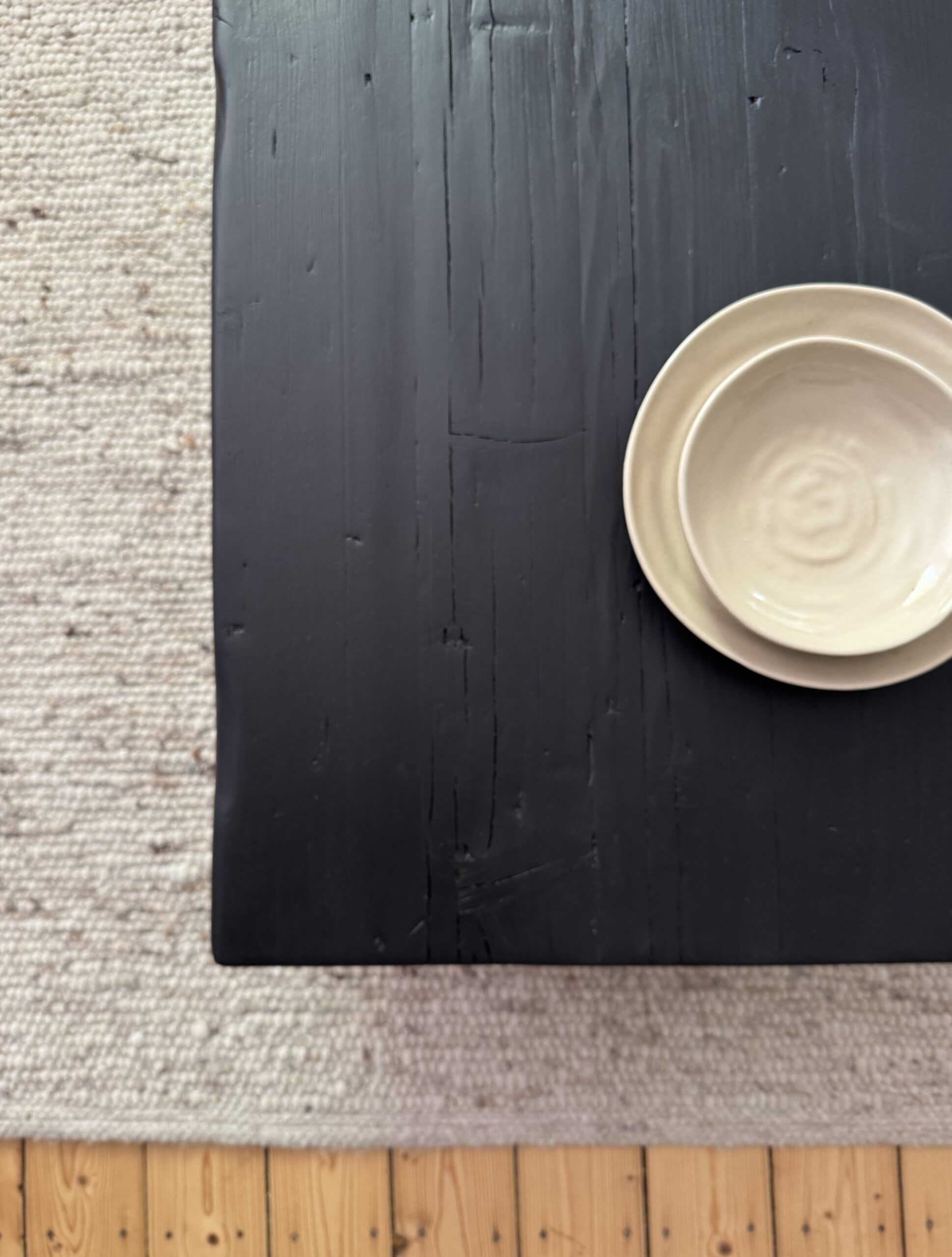 Für diesen Couchtisch werden alte Gerüstbohle in mehreren Schritten gebürstet und geschliffen. Anschließend wird das Holz in mehreren Durchgängen mit einer speziellen schwarz pigmentiertem Holzlasur behandelt. Zwischen den Durchgängen wird das Holz erneut fein geschliffen.