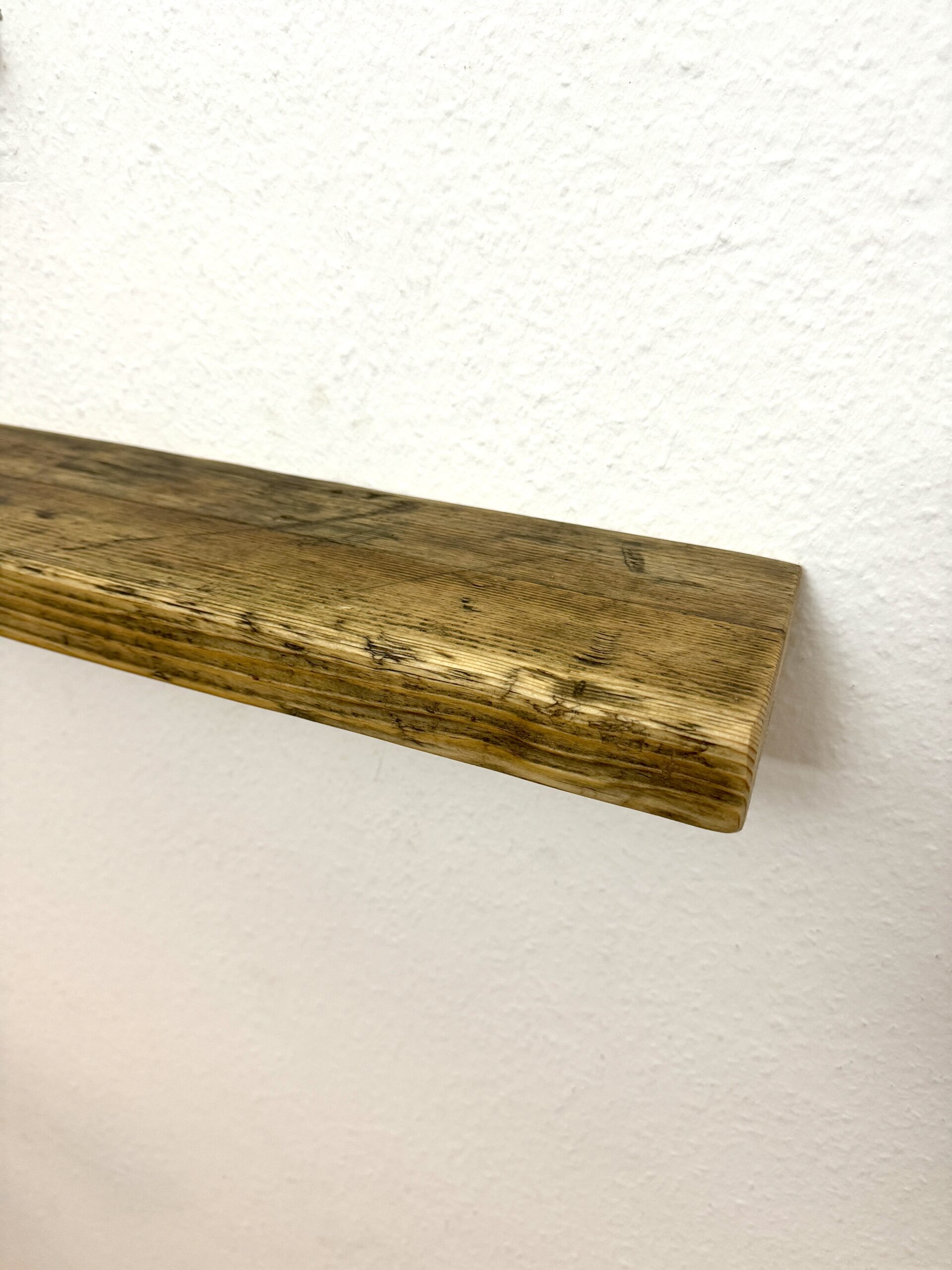 Dieses schwebende Wandregal wird aus alten Gerüstbohlen hergestellt. Das Holz wird in mehreren Schritten gebürstet und grob und fein geschliffen und im Anschluss mit Leinöl Firnis behandelt. Hierdurch kommt die Maserung der Holzes besonders zum Vorschein und das Holz erhält einen dunklere und wärmeren Farbton.