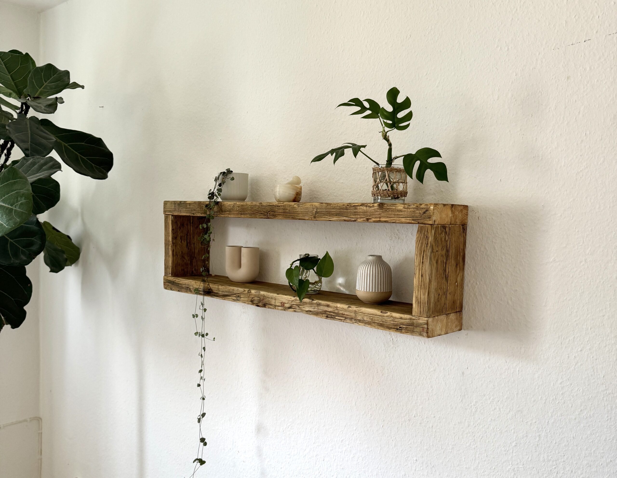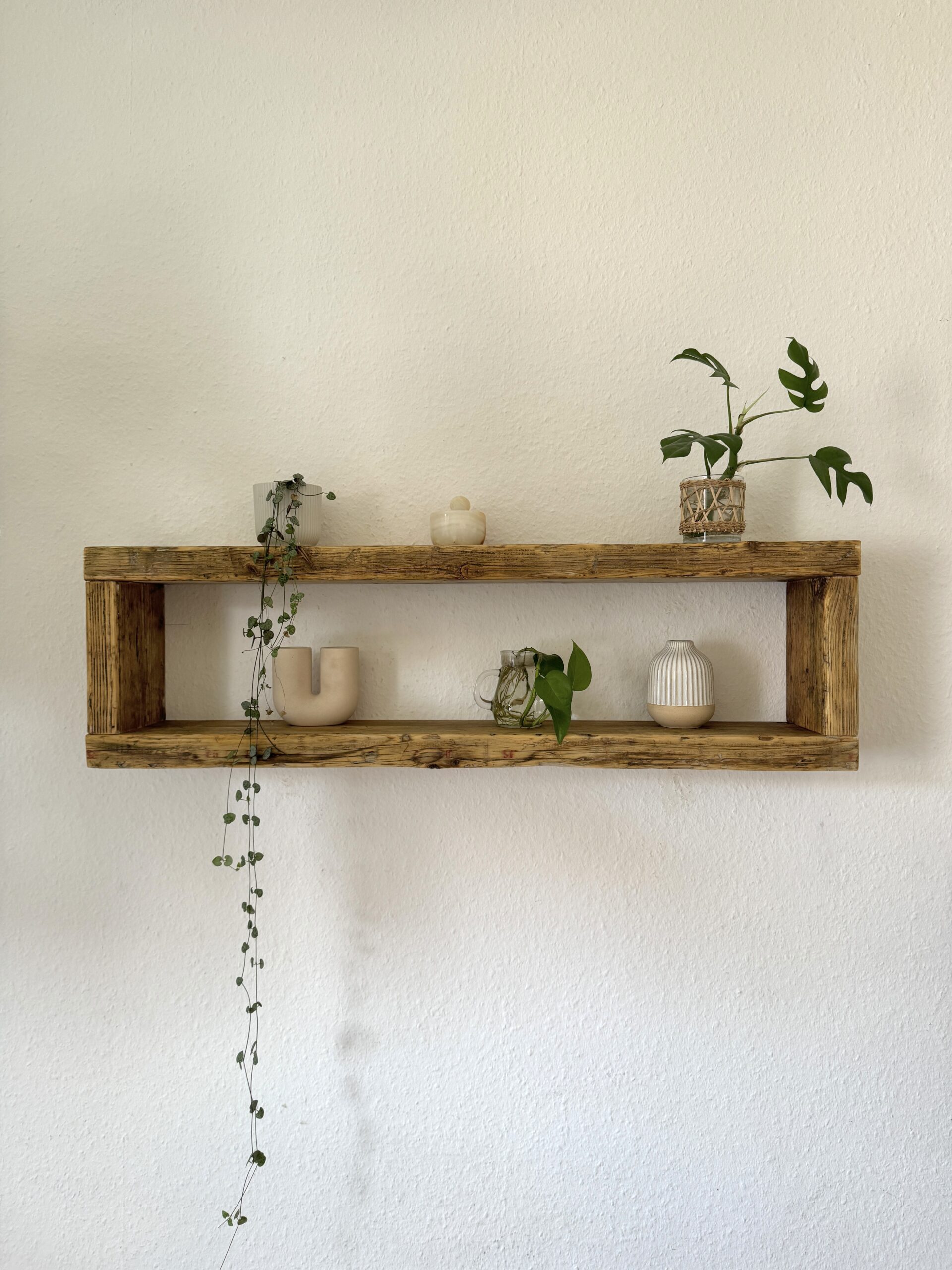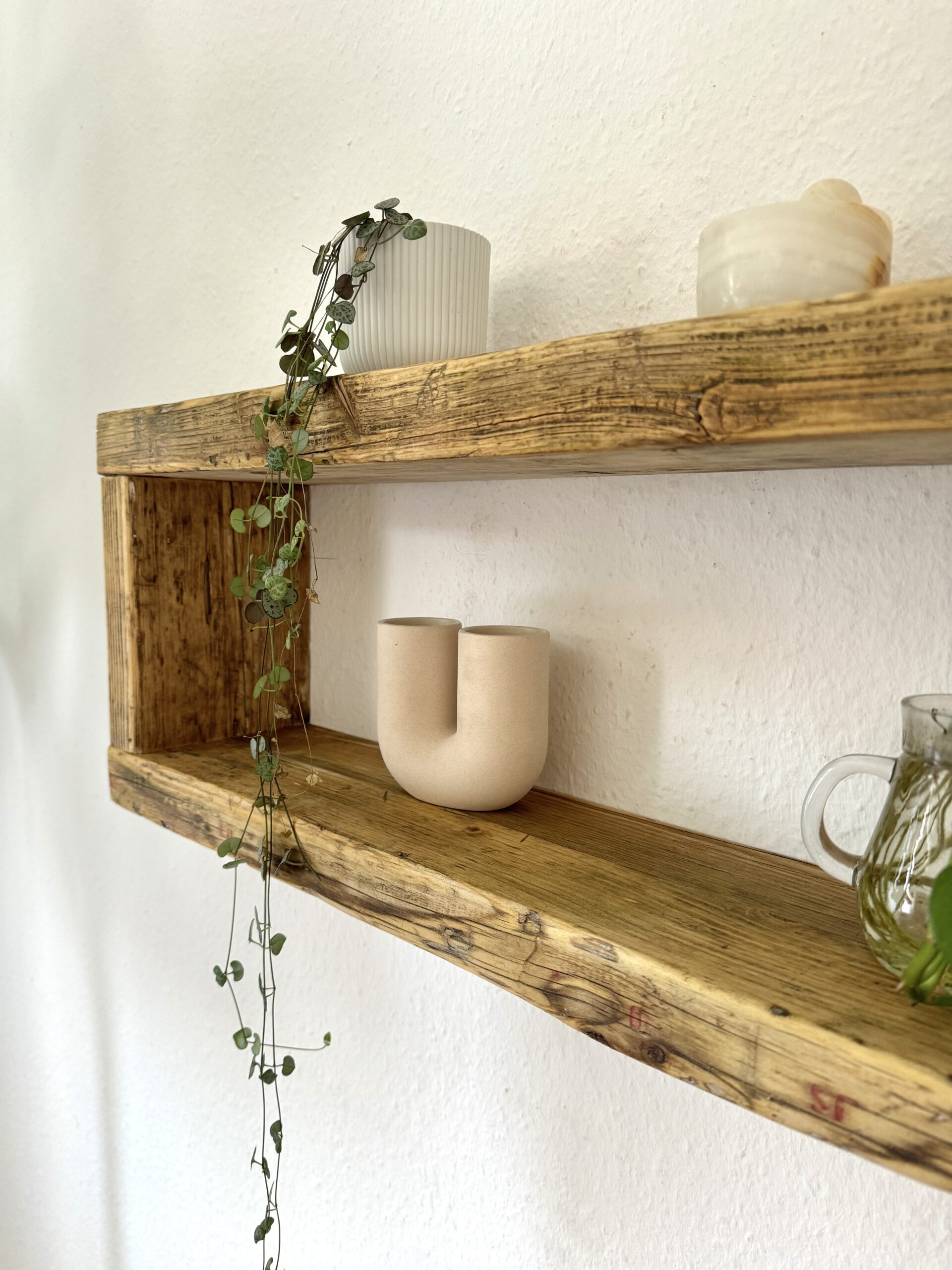 Jedes Regal ist aufgrund der Maserung des Holzes und des vorherigen Einsatzes einzigartig. Jedes Brett kann Astlöcher, kleine Risse und Macken enthalten.