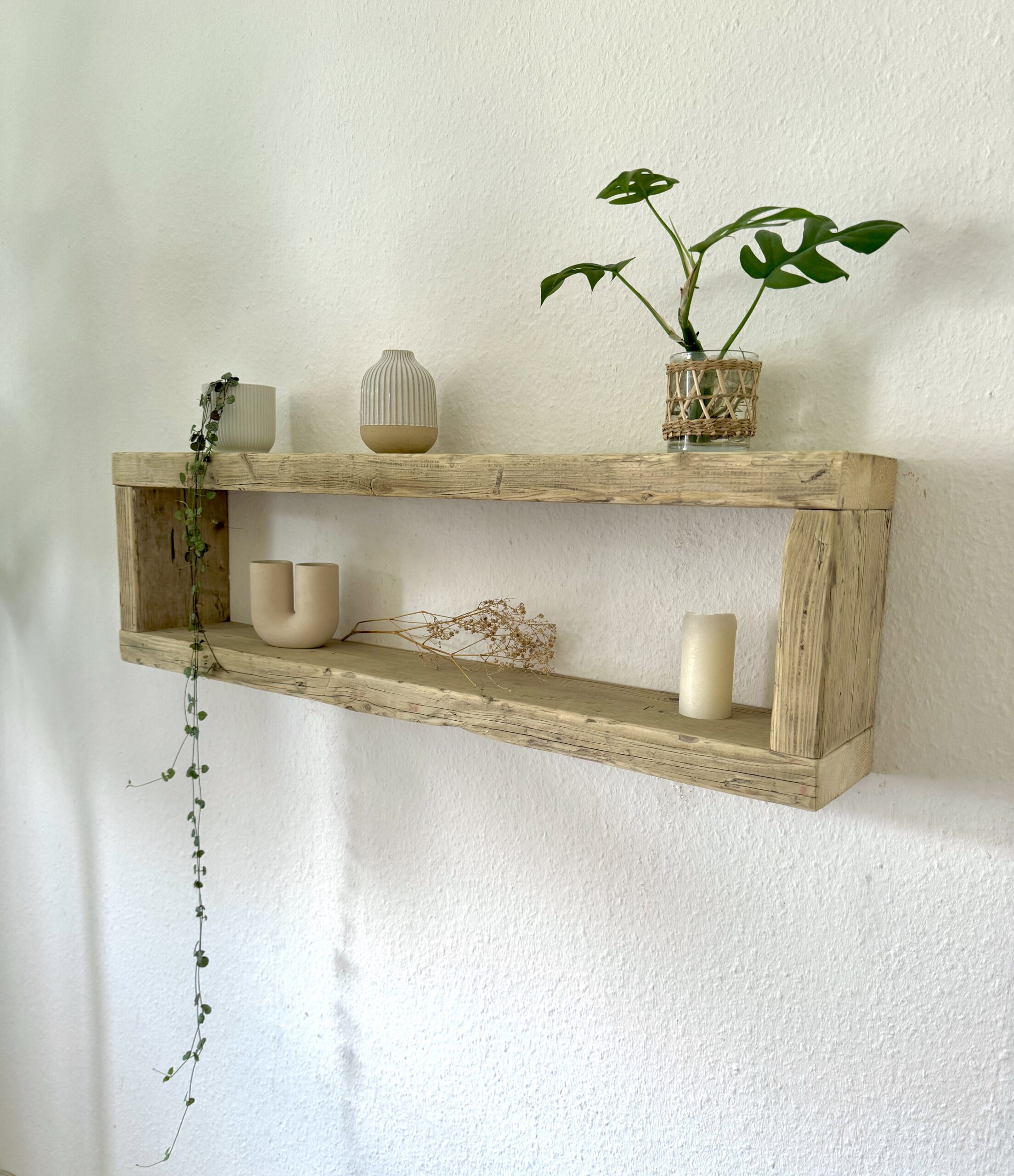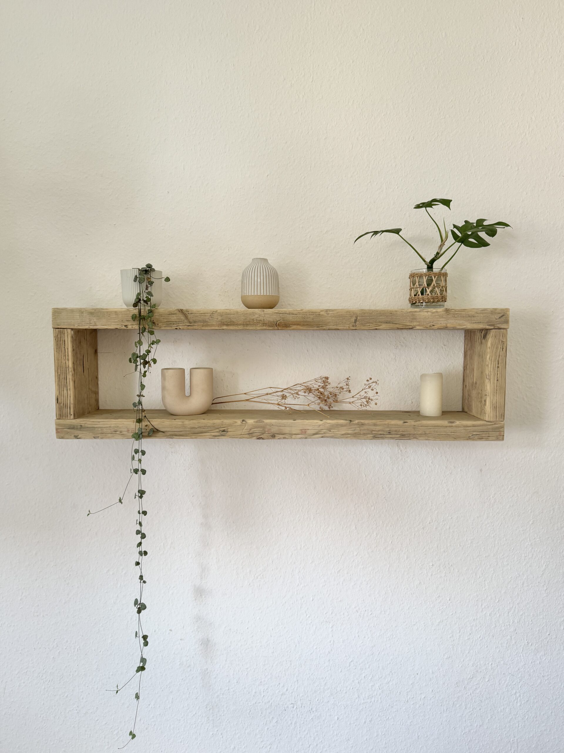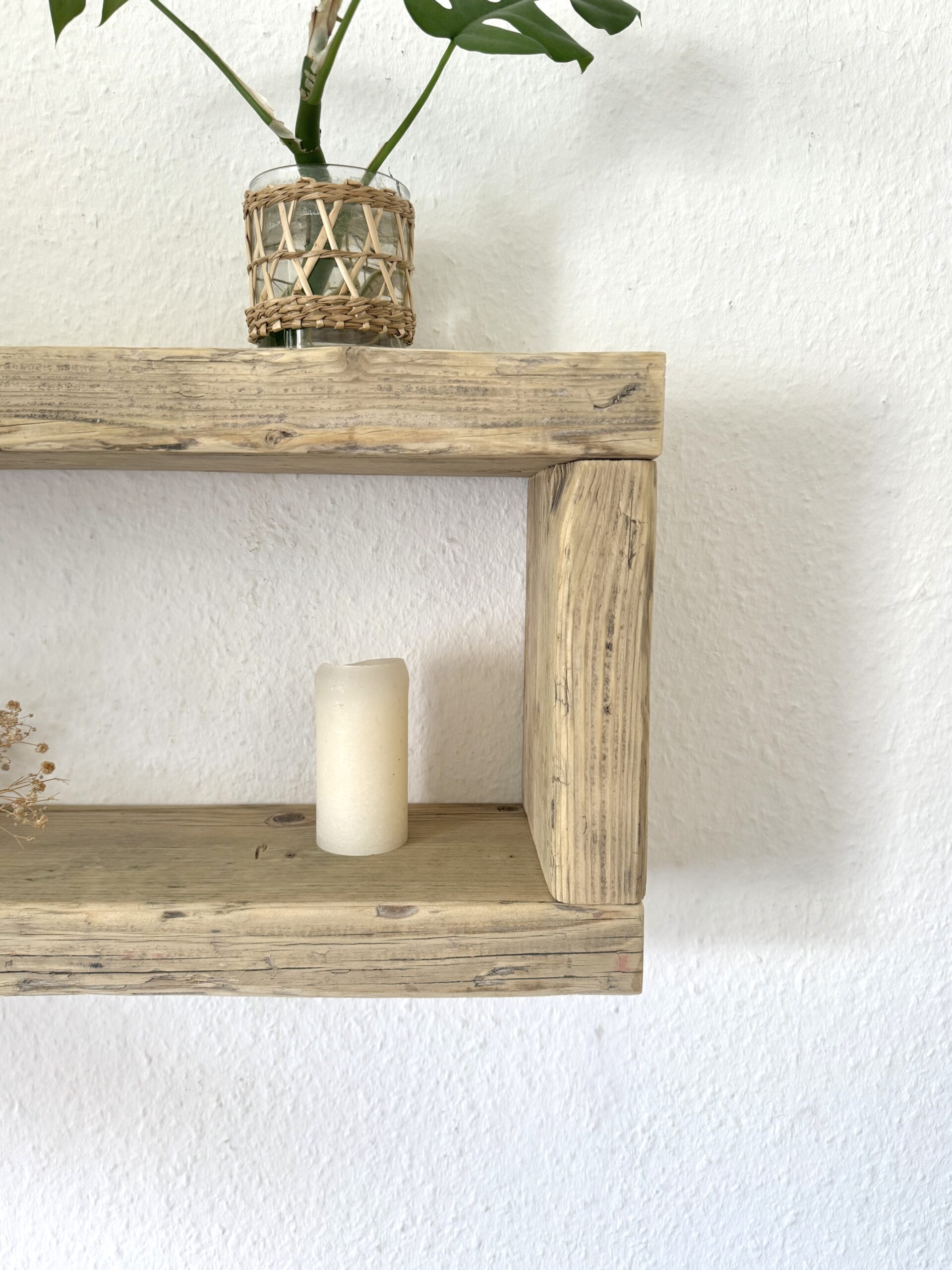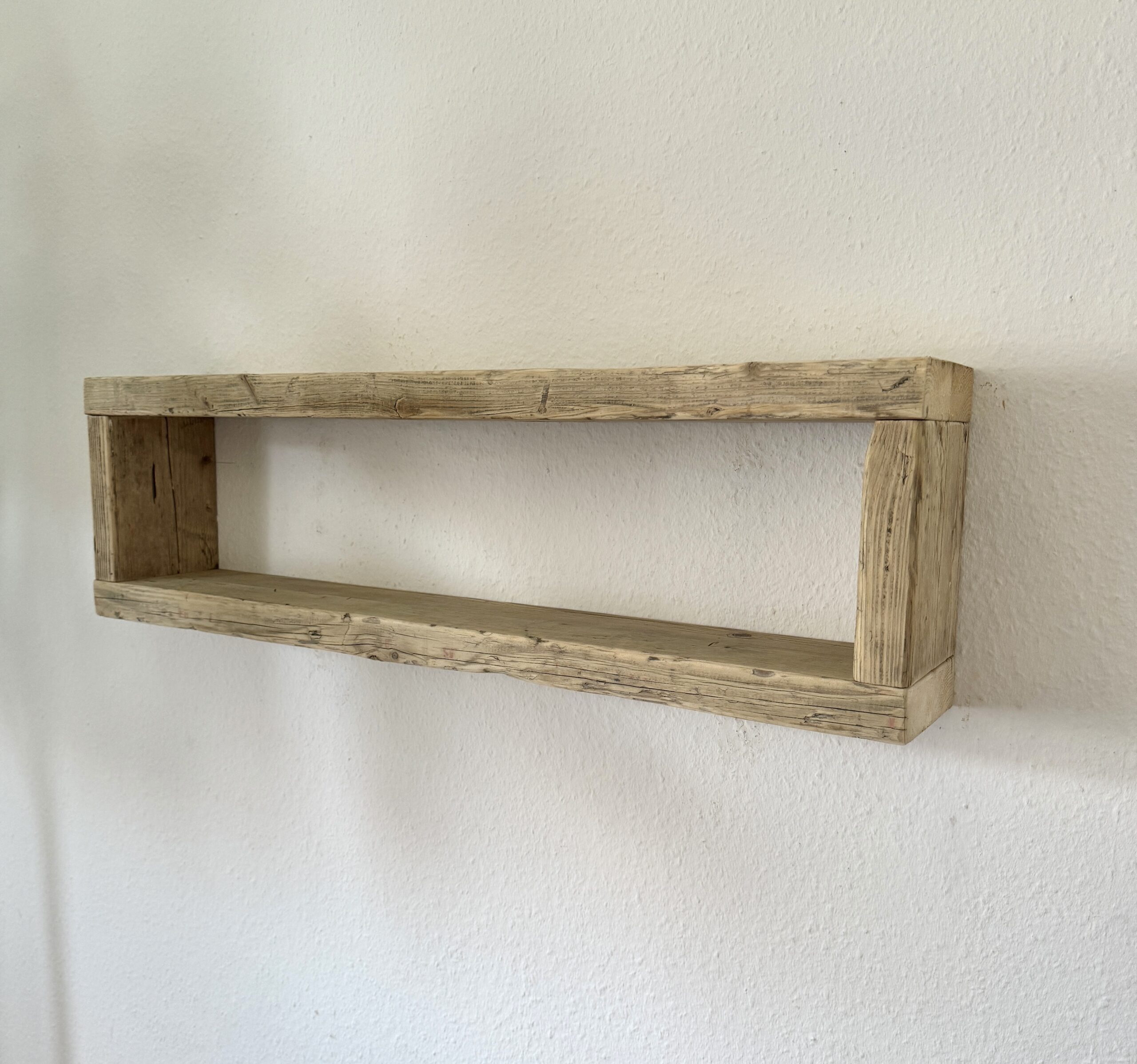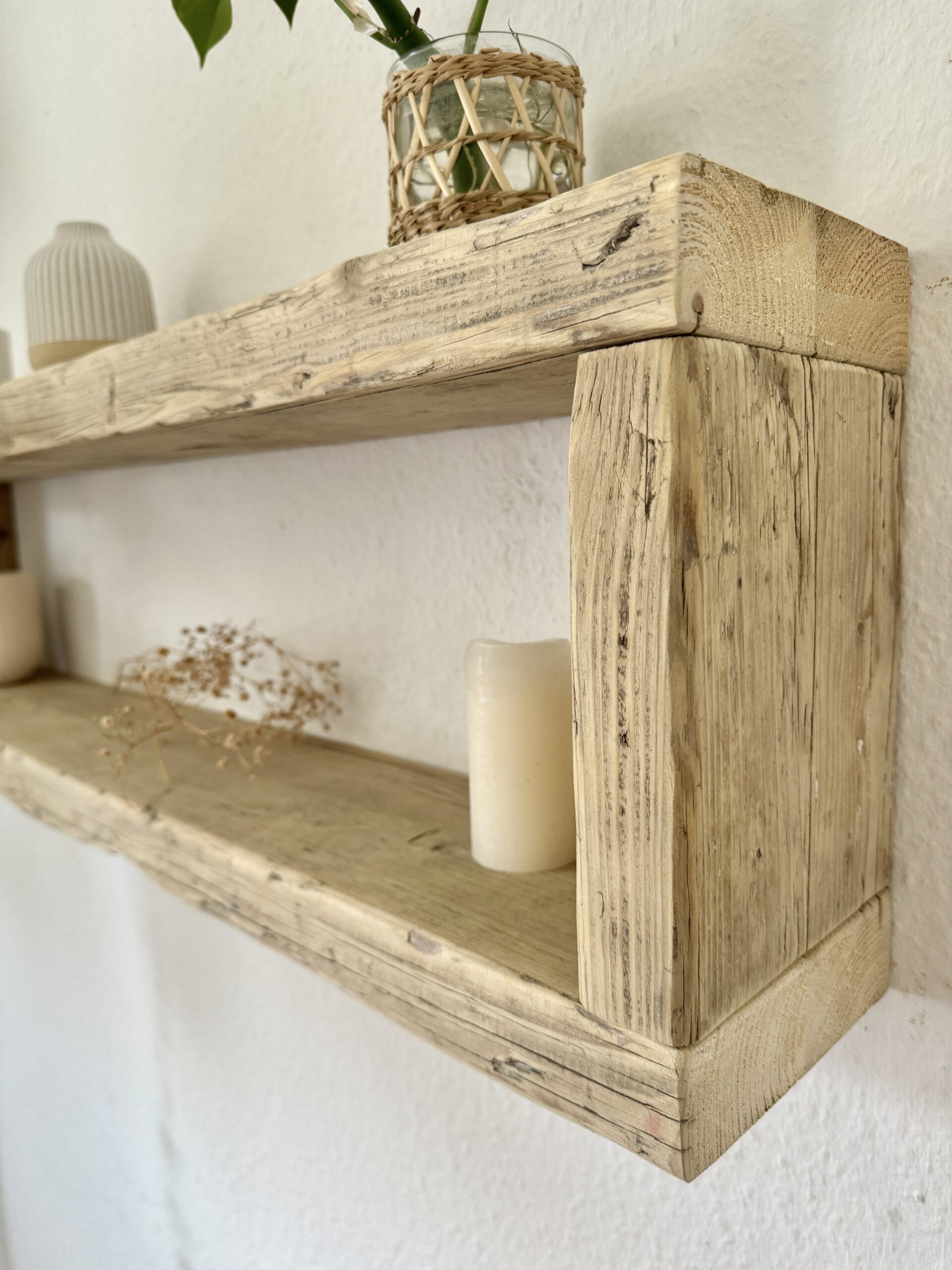 Jedes Regal ist aufgrund der Maserung des Holzes und des vorherigen Einsatzes einzigartig. Jedes Brett kann Astlöcher, kleine Risse und Macken enthalten.